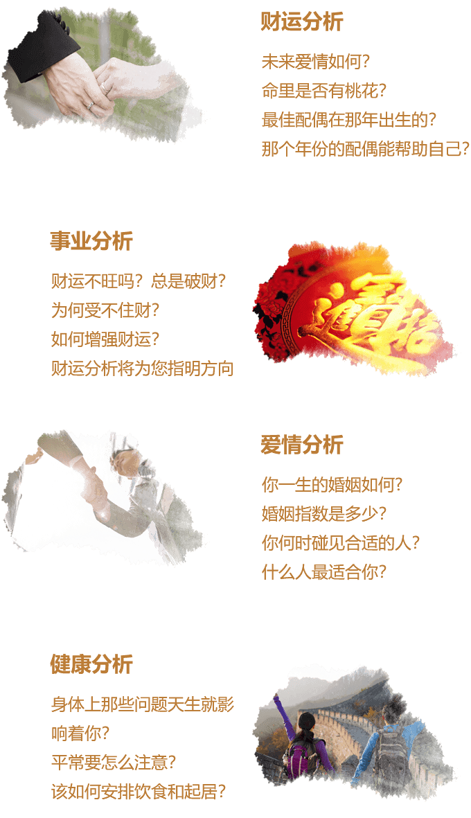 八字分析是传统文化中最古老而又最准确的命理预测方法,通过将一个人的出生年月日时进行八字排盘变成由天干、地支所组成的八个字,再对这八个字的五行相生、十神关系等进行分析,能准确预算出人一生的财运、婚姻、事业、健康等等。查看范例